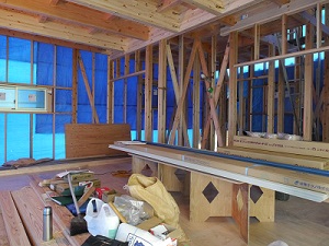 天井の下地も組み終わり、大工さんは部屋の下地のボードを張っています![]()