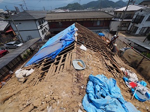 屋根の解体がある程度できたら、掃除をして、雨に備えてブルーシートで保護します![]()