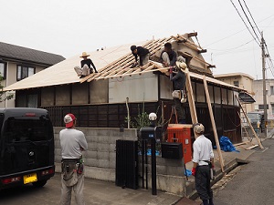 解体された屋根の下地を改めて作り直しています(^^*)今は、垂木(たるき)を屋根に取り付けています!