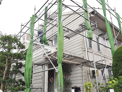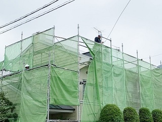 足場とシートを設置して、高圧洗浄をおこなっています!