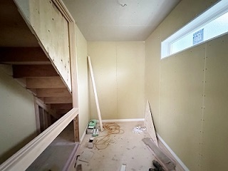 お家全体にパテをした後、クロス貼りに進んでいます。