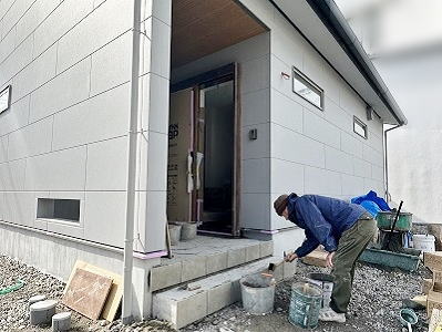 窓や玄関ドアも取り付けられ、電気配線工事などがおこなわれています。
